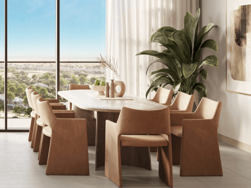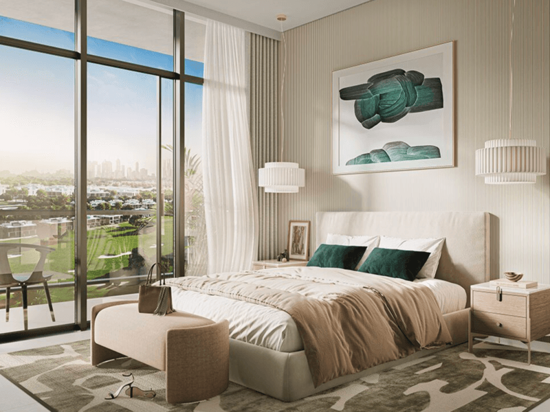 Infinity swimming pool and pool deck State-of-the-art fitness centre and yoga room Children's play area Outdoor lawn and BBQ area for events Rooftop lounge Indoor multi-purpose hall Ground floor retail stores and cafes Covered parking Views of the Dubai Hills Golf Course Interiors with neutral tones, porcelain tiles, and laminate shutters